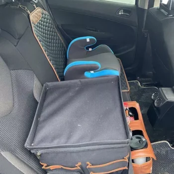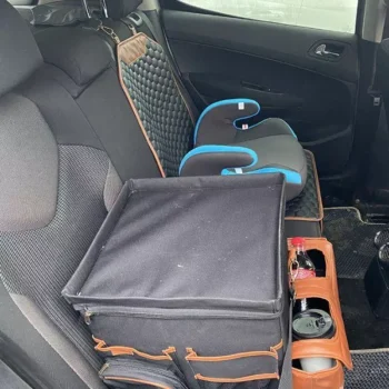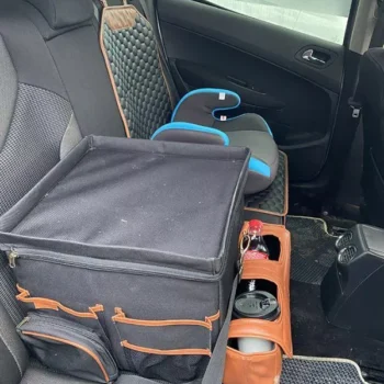 Large compartment with a removable divider, eight side pockets and two front pockets can hold everything you need on the road – from drinks to gadgets. It is suitable for all car models, and you can use it in your front seat, back seat, or even in the trunk. Plus, the lid works as a backseat table!