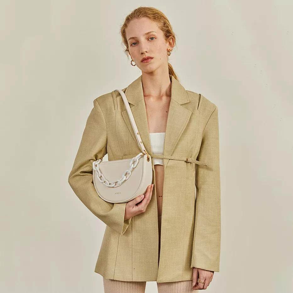 At the heart of its design is a commitment to both aesthetic appeal and practicality. Crafted with high-quality split leather and a durable polyester lining, this purse stands out not just for its beauty but also for its resilience. The unique semi-circle shape, complemented by a chic resin chain decoration, offers a nod to nostalgic elegance while keeping your look modern and fresh.